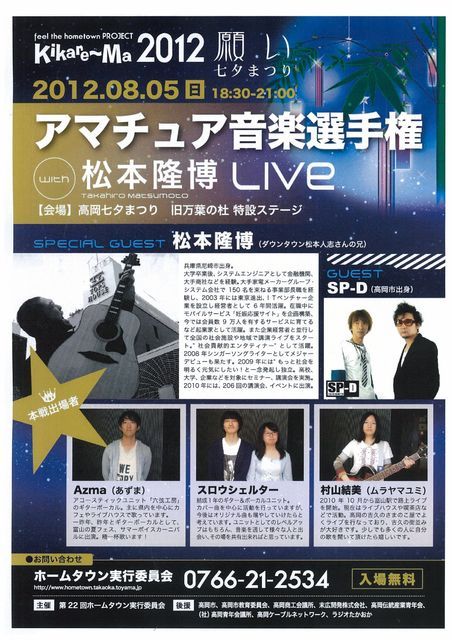■8月5日(日) Kikare〜Ma 2012 アマチュア音楽選手権 場所:高岡万葉の杜(高岡大和横) PM6:30〜 ※ゲスト出演: ・松本隆広(ダウンタウン松本人志の兄) ・SP-D ・音楽選手権 合格者3組 (入場無料) SP-Dライブ PM6:30〜