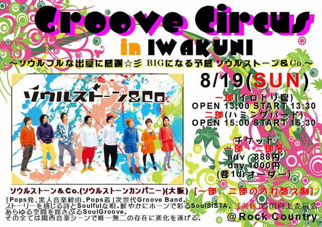 『Groove Circus in IWAKUNI〜ソウルフルな出愛に感謝☆彡 BIGになる予感 ソウルストーン&Co.〜 【主催】 岩国向上委員会 一部(イロトリ鳥) OPEN 13:00 START 13:30 二部(ハミングバード) OPEN 15:00 START 15:30 各チケット adv 888円 day 1000円(要1drオーダー) 【注】[一部、二部の入れ替え制です] 【ACT】 ★ソウルストーン&Co.(ソウルストーンカンパニー) http://www.soulstone-co.jp/ 「Pops発、黒人音楽経由、Pops着」次世代Groove Band。 ストーリーを感じる詩とSoulfulな唄。 鮮やかにホーンで彩るSoulSISTA。