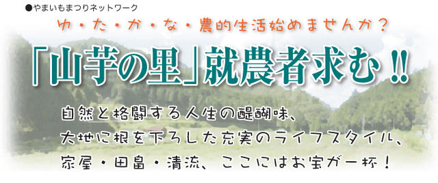 自然薯ってご存知ですか? 松茸とならんで栽培が難しいといわれる高級食材です。健康機能性の高さもあって、昨今では大いに注目されている作物です。この作物が周南市の特産品としても広く認められ始めています。周南市湯野周辺でも特産化事業が進められ、6次産業化と相まって、地域の活性にも一役買っています。 生産効率もよく、この産物の専業で営農も可能です。農水省が推進しています「人・農地プラン」も現在作成中で、研修生の受け入れも可能です。 ★8月12日(日)には盆帰りの青年たちをターゲットに新規就農のガイダンス(やまぐち