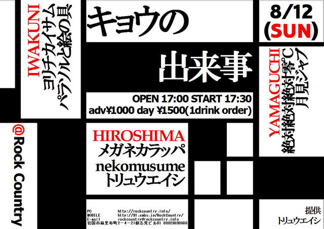 トリュウエイシ提供 『キョウの出来事』 OPEN 17:00 START 17:30 adv 1000円 day 1500円(要1drオーダー) 【ACT】 メガネカラッパ(広島) nekomusume(広島) 絶対絶対絶対零℃(山口) 月見ジャブ(山口) ヨリチカイサム(岩国) パラソルと絵の具(岩国) トリュウエイシ(広島)