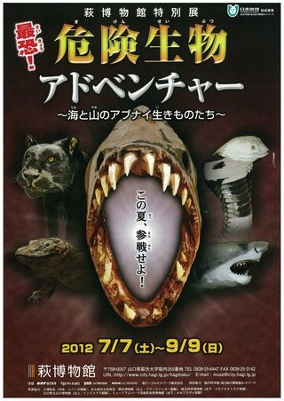 200種類の危険生物の標本や写真など、総勢300点が展示されている。 どんな危険生物がいるのか?また、それらをかわす知識とテクニックとは! 夏休みの親子連れ向け! この夏「最恐」のアドベンチャー系展覧会です。 ■会 期 : 7月7日(土)〜9月9日(日) ■場 所 : 萩博物館 ■開館時間 : 9:00〜17:00(入館は16:30まで) ■観 覧 料 : 大人500円、高大生300円、小中生100円 20名以上は団体割引20%、障がい者割引20% ■休 館 日 : なし(9月14日(金)は臨時休館) ■お問合せ : 萩