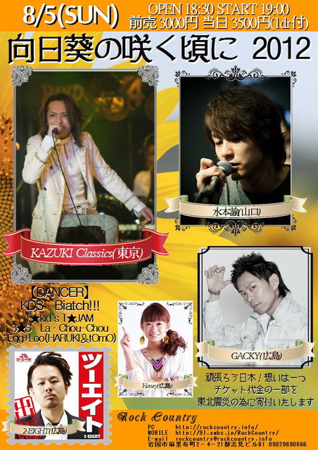 『向日葵の咲く頃に 2012』 OPEN 18:30 START 19:00 前売 3000円 当日 3500円 (1ドリンク付) 【ACT】 KAZUKI Classics(東京) 水本諭(山口) GACKY(広島) Honey(広島) 2エイト(広島) 【ダンサー】 KDS AMM T★kid's T★JAM S★S La・Chou-Chou “Egg+Loo(HARUKI&tOmO)