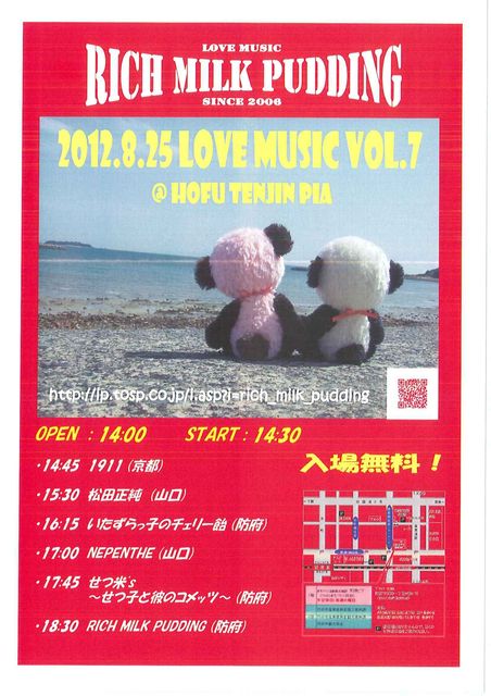 8/25(土) LOVE MUSIC Vol.7 @防府 天神ピア Open 14:00 Start 14:30 入場無料! オープニング 14:30〜 ?14:45〜15:15 1911(京都) http://17.xmbs.jp/1911/ ?15:30〜16:00 松田正純 http://www.c-able.ne.jp/~my-songs/ ?16:15〜16:45 いたずらっ子のチェリー飴 http://88.xmbs.jp/itazurakkonoxcherycan/ ?17:00〜17:30 NEPENTHE ?17:45〜18:15 せつ米'S 〜せつ子と彼のコメッツ〜 http://46.xmbs.jp/setsucomets/ http://www.facebook.com/setsucomets ?18:30〜19:00 RICH MILK PUDDING http://ip.tosp.