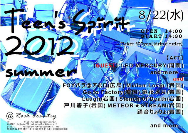 10代中心のイベント。 夏編! OPEN 14:00 START 14:30 チケット 500円 (要1ドリンクオーダー【ソフトドリンクは300円】) 【ACT】 Led Marcury(周南) FOYパラ@アポロ(広島) Mi//ion:Lovin′(岩国) Laugh(岩国) 戸川碧子(岩国) Stench of Death(岩国) Go to Factory(岩国) 鏡花水月(岩国) METEOR★STREAM(岩国) 踊音りょりょ(岩国) and more...