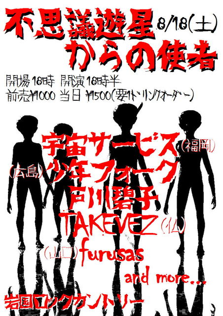『不思議遊星からの使者』 OPEN 18:00 START 18:30 adv 1000円 day 1500(要1Drオーダー) 【ACT】 宇宙サービス(福岡) furusas(山口) 少年フォーク(広島) TAKEVEZ(仏) 戸川碧子(岩国) and more...