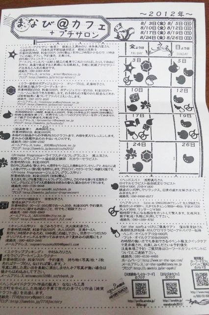 8月の毎週金・日曜日、ローフードカフェといろいろなワークショップが開催されます。 ◆日にち:8月3・5・10・12・17・19・24・26日の8日間 ◆時間:10:00〜13:00 ◆場所:自由空間ナマステ 揖斐郡池田町八幡2579-3 ◆内容:シルバーアクセサリー教室 1000円 ・カラー診断 1000円&ボディジュエリー 500円〜 ・レジンアクセサリー教室 大人1000円 子供600円 ・絵画教室 1000円 ・フレグランスアート 10