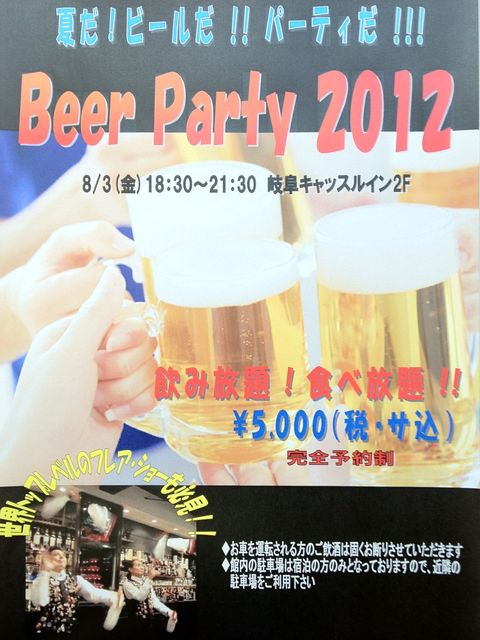 Beer Party 2012 毎年恒例、「Beer Party」がやってきました 今年もノリノリでいきましょう〜 フレンチ〜和食まで手掛ける総料理長が 食べ放題・飲み放題で皆さんをおもてなし 去年大好評だった「ウマッチョ」によるショー・タイム 今回は日本フレアバーテンズ協会東海地区代表、 世界フレア大会で第三位の「TATULA(タトゥーラ)」が 出演しまよw これは必見 スタッフも今から楽しみです ************************* 「フレア