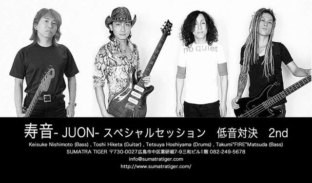 貴重なスペースをお貸し頂きありがとうございます。 ヴァン・ヘイレンのデビッド・リー・ロスに唯一認められた東洋人としてDLR BANDに加入した日本人ギタリスト『トシ・ヒケタ』率いる超ハイテクニック・ロックインスト・グループ“寿音”の広島公演が今年も決定しました。 今回も昨年に引き続き、ツインベース体制でのスペシャルメニュー 現在、絢香や矢井田瞳と活動するベーシスト“ファイアー”と広島在住のベーシスト 西本圭介のハイテクニック・ツインベースをお楽しみいただけます。 ドラマーは今年の5月には日本の重鎮メタルバンド