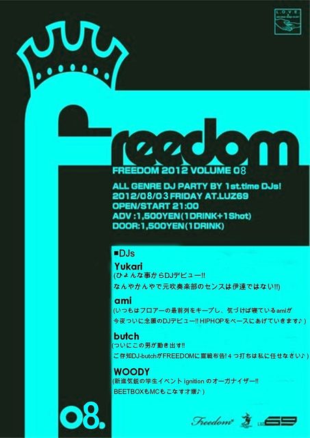 FREEDOM 2012 vol.8 [ALL GENRE] ■2012/08/3(Fri) ■OPEN/START 21:00- ■ADV :\1,500(1D+1Shot) ■DOOR:\1,500(1D) ■DJs ・Yukari (ひょんなことからamiと一緒にDJデビュー!なんやかんやで元吹奏楽部のセンスは伊達じゃない!乞うご期待!) ・ami (いつもはフロアの最前線をキープし、気づけば寝てるamiが今夜ついに念願のDJデビュー!HIPHOPをベースに上げて行きます!) ・butch (ついにこの男が動き出す!ご存知DJ butchがfreedomに宣戦布告!4つ打ちは俺に任せろ!!) ・WOODY(ignition) (学生イベ