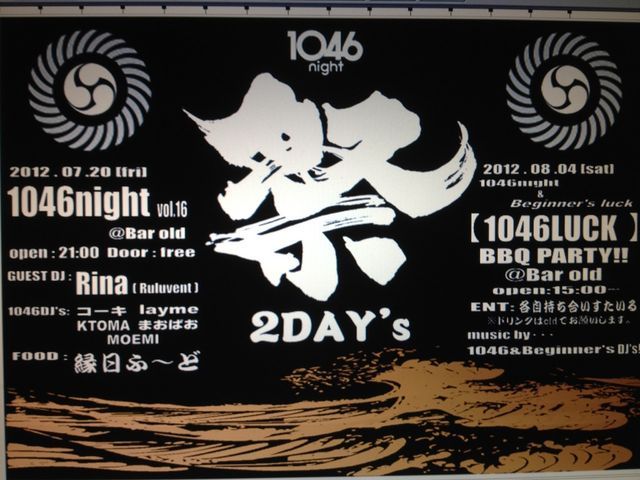 祭2DAYS 2日目 素人の祭典こと 1046NIGHTと・・・ ド素人の祭典こと ビギナーズラックが・・・ コラボレーション! そのまま 「1046 LUCK」 とは名ばかり! ただ oldの横で BBQやりたいだけです! 会費はナシで 自分の焼きたいもん 食べたいもん持ち寄って 飲み物はoldで買いましょう ★日時★ 8月4日(土)15時くらいから ★場所★ old(新中野の自由空間の裏!) ★入場料★ 無料 タイムテーブル 15:00から