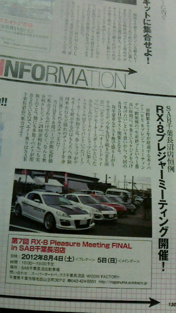 ハイパーレブvol.165、RX-8 No.4に掲載の情報です。 今回で第7回目にして最期となる、RX-8プレジャーミーティングがSAB千葉長沼店で行われるそうです。 8月4日(土)がプレデー、明日の5日(日)がメインデーとなるイベント RE雨宮、Rマジック、オーバードライブ、レッグモータースポーツ、トラスト、M7ジャパンなどのショップ・メーカーも参加、 体験同乗走行やRX-8パーツの限定特価販売もある模様です。