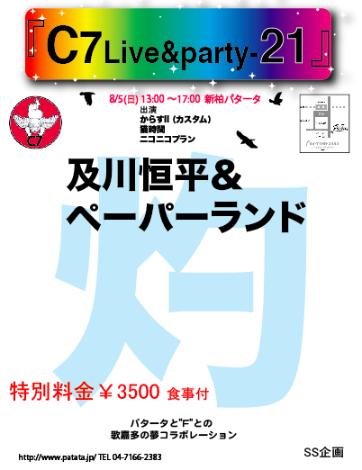 パタータ"と"F"との 歌嘉多の夢コラボレーション 2012年08月5日 (日) *12:30 開場, 13:00〜 開演 *3,500円(食事付)ドリンク別 (お子ちゃま2,500円) 出演 からすII カスタム 猫時間 ニコニコプラン そして特別ゲスト 『及川恒平&ペーパーランド』 今回のテーマは『灼』灼熱の『灼』である。 しゃくねつ=〔赤く熱すること〕 あらた‐か【灼たか】 神仏の利益(りやく)が際立ってあるさま。 青春は終らない 幾つ歳を重ねても 旅立ちは希望であり 出会いの扉なのだ 叩くのも見てるのも 前で