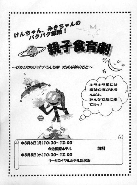 ★8月の「食育」無料★ 8月は夏休みということもあり、お子さんと一緒に食育が学べるように、 「親子食育劇」(けんちゃん、、みきちゃんのパクパク探検隊!) というのがあります。 近くの幼稚園の子供たちも観にやってきます。 是非是非、お一人でも、お子様連れでも、お友達とでも、いらしてくださいね。 行こうと思われる方は、ご一報くださいね。 よろしくお願いします<(_ _)>。