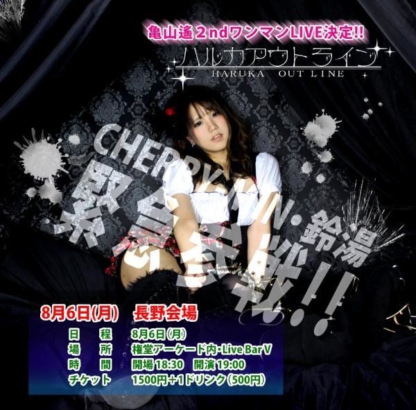 HARUKA KAMEYAMA 2ndワンマンLIVE 『ハルカアウトライン-2nd flight-』 ■日時 2012/8/6(月) OPEN18:30/START19:00 ■会場 権堂アーケード内・Live Bar V(MUSIC HALL V) 長野県長野市大字鶴賀権堂町2270-1 TEL:026・237・8070 ■チケット 予約¥1500 (+1drink 500yen) ■出演 亀山遙 ■ゲスト出演 鈴湯 CHERRY-MIN