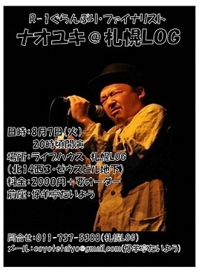 急な告知で面目次第も御座いません 2011R-1ぐらんぷりファイナリストの “ナオユキ”が札幌LOGでライブを行います 僭越ながら前座を務めさせて頂きます “仔羊亭たいよう”が 此方で告知させていただいております 20時頃の開演で、料金は2000円+オーダー 札幌LOGで音楽以外のライブは そんなにありませんのでね 皆様にも楽しんで頂けると思います どうぞヨロシク哀愁願います