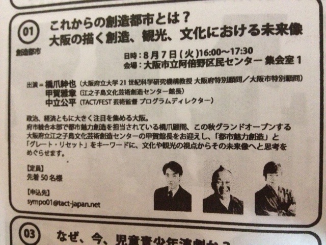 橋爪 紳也先生 (大阪市 特別顧問) 甲賀 雅章先生 (江之子島 文化芸術創造センター館長) による、創造都市 シンポジウム 入場無料。 必見です。