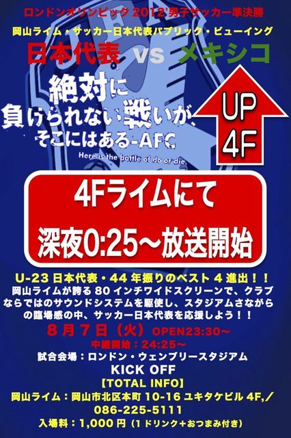 勝てば金or銀メダル確定の歴史的ゲームです!! ライム・パブリックビューイング ロンドンオリンピック 男子サッカー準決勝 “日本 vs メキシコ” 8月7日(火)OPEN 23:30〜 中継開始 0:25〜 入場料 : \1000 (1ドリンク無料+おつまみ付き) 大画面80インチとライムが誇るサウンドシステムで、 スタジアムさながらの臨場感の中、 日本代表の歴史的対戦を応援しよう! okayama RHYME 岡山市北区本町10-16幸武ビル4F 086-225-5111