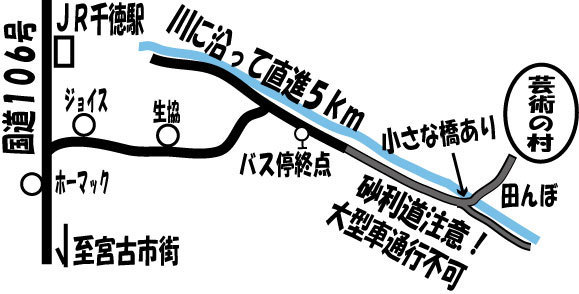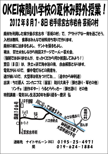 宮古市千徳駅から約7km林道を登る。おおまかにこのへん↓ http://maps.loco.yahoo.co.jp/maps?p=%E5%B2%A9%E6%89%8B%E7%9C%8C%E5%AE%AE%E5%8F%A4%E5%B8%82%E5%8D%83%E5%BE%B3%E7%AC%AC28%E5%9C%B0%E5%89%B2&lat=39.65289682&lon=141.88052126&ei=utf-8&gov=03202.147.127&z=18 オッケー野外授業、今年もやります! 廃材を利用した家が並ぶ宮古市「芸術の村」で、アウトドアな一夜を過ごそう。 入村は無料 食事はみんなで材料持ち寄りで作ります。 廃材の家に泊まるもよし、テントを張るもよし。 夜は、焚き火をしながら特設ステージで、一