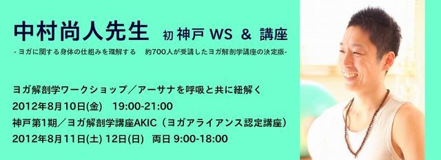 【図解】YOGAアナトミー 筋骨格編 の監訳の中村尚人先生のWSです。 http://cherry-blossoms.jp/event.html#nakamuranaoto-akic 【日程/Date】 2012年8月10日(金) 19:00-21:00 【内容/Contents】 呼吸と共に動く事がアーサナの特長ですが、ただ呼吸をすればいいのでしょうか。 どこに意識を持っていけばいいのか、呼吸と身体の相互関係を基礎解剖学の知識をもとに、実際に動きながら解説していきます。 いつも行っているアーサナが違って感じるかも知れません。呼吸と共に新しい自分の可能性に出会いましょう。 【場
