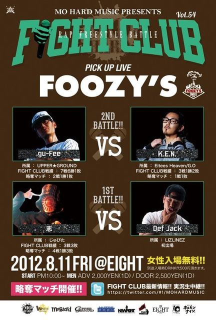 === MO HARD MUSIC PRESENTS "FIGHT CLUB" Vol.54 === 2012.8.10 FRIDAY RAP FREESTYLE BATTLE!! START PM10:00~ MEN : ADV 2,000yen(1D) / DOOR 2,500yen(1D) LADIES CHARGE FREE!! 但し入場の際ドリンク代500円頂きます。 ↓↓↓PICK UP LIVE↓↓↓ FOOZY'S ↓↓↓FREE STYLE BATTLE↓↓↓ 1st BATTLE : 志 (じゃぴゅた) VS Def Jack (LIZLINEZ) 2nd BATTLE : gu-Fee (UPPER★GROUND) VS K.E.N. (Eitees Heaven/G.O) ↓↓↓FLOOR DJ↓↓↓ JUNJUN (SUGAR CRU) / REEMAN FLYDAY (SOUL
