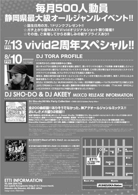 管理人様、告知失礼致します! 静岡県内最大級の集客と盛り上がりを見せるvividの2周年記念イベント第二弾!!! 今回はGuestにDJ Tora氏を迎えガチアゲ間違いなし! 各種企画多数有り!さらなる盛り上がりをみせるvividが静岡の真夏を飾る♪ Lady GagaからKARAまで、何が飛び出すかわからない完全オールジャンルパーティー 静岡最大級 静岡を代表するPARTYと言っても過言ではない 既に鉄板となっている毎月第2金曜日ETTIの人気レギュラーPARTY クラバーから普段クラブ遊びされない方でも気軽にハ