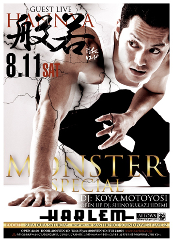 管理人様、告知失礼致します。 毎週土曜!! MONSTER 8/11は MONSTER SP!!!!! GUEST LIVEに 般若 を迎えての開催!! エントランスにて ★★★★★★★★★★★★★★★★★★★★★★★★ 「アローズのゲストでmixi」 とお伝え頂ければ 通常3000のところを 2000/1d で入場できます!! ★★★★★★★★★★★★★★★★★★★★★★★★ 詳細はフライヤー画像をご覧ください☆ ハーレム土曜 "MONSTER" 『こんなシーンを待ってたぜ!』渋谷HIP HOP四天王が土曜のHARLEM