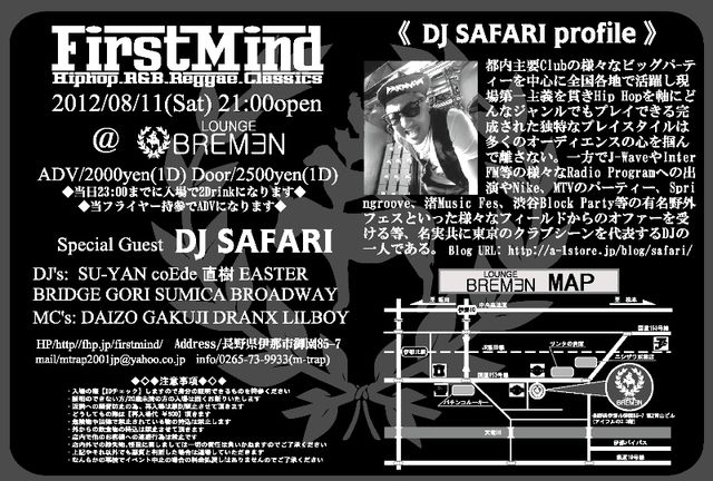 管理人様告知失礼します。 ◆◇◆◇◆◇◆◇◆◇◆◇◆◇◆◇ m-trap Present DJ ONLY PARTY 【First'Mind】 〜HIPHOP/R&B/REGGAE/CLASSICS〜 SPECIAL GUEST 【DJ SAFARI】 ◆◇◆◇◆◇◆◇◆◇◆◇◆◇◆◇ ↓↓↓詳細は下記のとおりです。↓↓↓ 【場所】 @ LOUNGE BREMEN 長野県伊那市御園85-7(R153沿いアイフル上) 【日時】 2012年08月11日(土) 21:00スタート 【入場】 ADV:¥2000(1D) DOOR:¥2500(1D) 《23:00までに入ると?ドリン