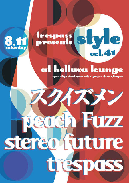 神戸のtrespassです。 本日はstereo futureご出演の自主企画“Style”の宣伝をさせて下さい! 08/11(土)神戸HELLUVA LOUNGE trespass presents“Style”vol.41 open 18:30 start 19:00 adv 1500 door 1800 ●スクイズメン(http://www.s-quizmen.com/) 昨年リリースのアルバム「エメラルドラム」でも高い評価を得た現編成での鉄壁の演奏は、もはやポストロック/エレクトロニカ/インディーロック等の言葉では語り切れない独自の歌世界を構築!彼らにしか描き得ない「いつか見た風景」を体験してください! ●peach Fuzz(http://www