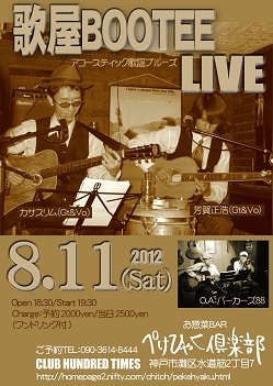 皆様是非お越し下さい♪♪ ■2012.8.11(Sat) 歌屋BOOTEE LIVE ■出演:カサスリム(Gt&Vo)/芳賀正浩(Gt&Vo) ■O.A出演:バーカーズ88・・・カズヤン(Vo&Harp)バルタン松尾(Vo&Gt) ■Open 18:30/Start 19:30 ■Charge ご予約 2000yen/当日 2500yen(共にワンドリンク付き) ■お惣菜BAR ぺけひゃく倶楽部:神戸市灘区水道筋2丁目7 ■ご予約TEL:090-3614-8444 【歌屋BOOTEE】 上田正樹でも有山淳司でもない、憂歌団とも違う”音” ”空気”を持つ歌屋BOOTEE。 切なくてどこか滑稽、粋がっているのにカッコ悪い、悲しいのにわら