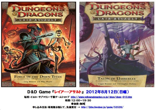イエローサブマリン・千葉ゲームショップでは、毎月第2日曜日に、ダンジョンズ&ドラゴンズ・エンカウンターズの旧シーズン・シナリオを、キャンペーン形式でプレイしておりますが、8月は少し趣向を変えて、単発のイベントを開催したいと思います。