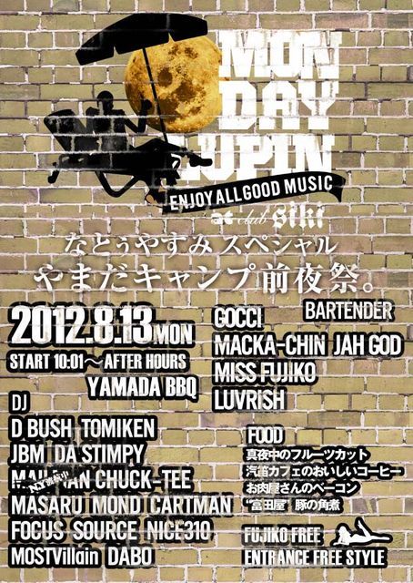 第15回☆ 2012.08.13 MON ☆ ◯ MONDAY LUPIN ◯ ENJOY ALL GOOD MUSIC なとぅやすみスペシャル! マンルパ 大BBQ前夜祭 DJz D-BUSH TOMIKEN JBM DA STIMPY SHIMONE NISSIN MAILMAN NY渡米中!〜 一時帰国! CHUCK-T MASARU MOND CARTMAAN FOCUS SOURCE NICE310 MOSTVILLAIN DABO BARTENDER MACKA-CHIN JAH GOD GOCCI MISS FUJIKO LUVRISH FOOD 真夜中のフルーツカット お肉屋さんのベーコン 富田屋 豚の角煮 汽笛カフェ などなど.... FUJIKO FREE !!!!!! マダムサービス有り PRICE ENTRANCE ONE