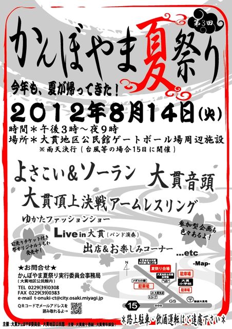 第3回 大貫かんぼやま夏祭り 日時★ 2012年8月14日(火) ※雨天決行(台風の場合、延期あり) 場所★ 大崎市田尻大貫地区公民館ゲートボール場周辺施設 時間★ pm3時〜pm9時 内容★ よさこい&ソーラン 加護坊音頭 出店&お楽しみコーナー 大貫頂上決戦アームレスリング Live in 大貫 浴衣ファッションショー …etc 地元の人も、そうじゃない人も楽しめる参加型企画も多数あります♪ お盆中のお忙しい中とは存じますが、お隣近所お誘い合わせで是非お越し下さい。 皆様のご