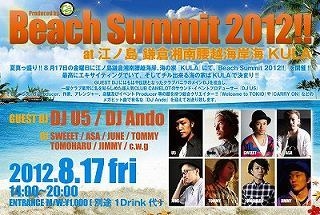 夏真っ盛り!! 8月17日の金曜日に江ノ島鎌倉湘南腰越海岸、海の家『KULA』にて、『Beach Summit 2012!!』を開催!! 最高にエキサイティングでいて、そしてチル出来る海の家はKULAで決まり!! GUEST DJにはもはや伝説となったクラブバニラのメインDJを担当し、 一躍クラブ業界に名を知らしめた超人気CLUB CAMELOTのサウンド・イベントプロデューサー『DJ U5』 そして、Sound Producer、作家、アレンジャー、店舗及びイベントProducer等の顔を持つ総合クリエイター!! 『Welcome to TOKIO』や『CARRY ON』などのメガヒット曲で有名な『D