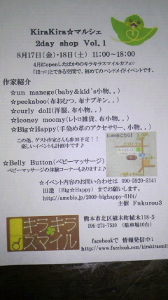 4月にopenしたばかりのキラキラスマイルカフェ 「ほっ」とできる空間で、初めてのハンドメイドイベントです。 日時 8月17日(金)・18日(土) 11:00〜18:00 場所 キラキラスマイルカフェ 熊本市北区植木町植木118-5(駐車場10台) http://www.facebook.com/kirakirasmilecafe 096-273-7530 作家紹介 un manege(baby&kid’s小物..) peekaboo(布おむつ、布ナプキン..) curly doll(洋服、布小物..)