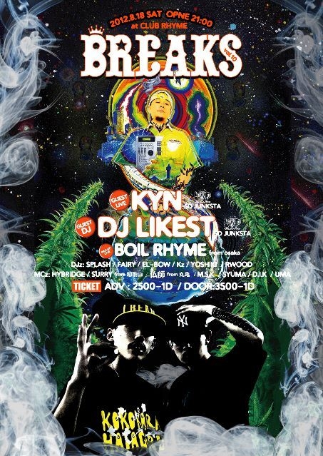 管理人さま告知失礼します。 8.18(sat)at RHYME 「BREAKS vol.10」 ADV:2500-1D /DOOR:3500-1D SPECIAL GUEST KYN (SD JUNKSTA) DJ LIKEST(SD JUNKSTA) PICK UP BOIL RHYME from Osaka ■DJ'z■ SPLASH EL-BOW FAIRY Kz YOSHIKI RWOOD ■MC'z■ HYBRIDGE SURRY from 和歌山 仏師 from 丸亀 M.S.K D.i.K SYUMA UMA 質問やチケットなどのお問い合わせはお気軽にメッセージください!!