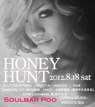 8.18 HONEY HUNT 予告 open 9:00〜ALL charge \2000 2drinks DJ / TAKAYASU 、 SHOTA 、 maco☆ 、 Ka2 show case 1時〜 DANCER / DT Boogie ・ MKC ・ 小林沙夜加(田村ヤスヨ88) ・ DFS Lockerz ・ 美☆グルメ部(民 team) ...and more