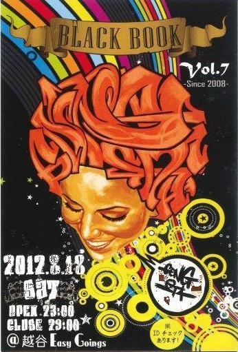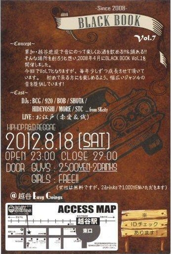 〜TEAM GENG.sta PRESENTS.〜 【BLACK BOOK Vol.7】 at.越谷 Easy Goings DATE 2012.8.18.SAT TIME OPEN 23:00 CLOSE 29:00 PRICE Guys/2500yen-2D Girls/Free (女性無料ですが、入場時2drinksで1000yen頂戴します) ※IDチェックあり GENRE Hip Hop/R&B/Reggae/etc... 【DJs】 BCG 920 BOB SHOTA HIDEYOSI MORE STC...from SKctiy 【LIVE】 お江戸 (赤愛&銭) 【CONCEPT】 草加・越谷近辺で音にのって楽しくお酒を飲める!! & 踊れる!! そんな場所を創ろうと想い、2008年