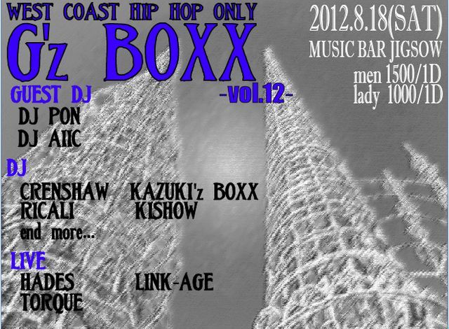 G'z BOXX vol.12 8.18(SAT) ADV 1500/1D GUEST DJ OFR ( ONE FORTY ROLLERZ) AIIC ( G'z BOXX ORIGINAL DJ) DJ CRENSHAW KAZUKI'z BOXX KISHOW RICALI end more... LIVE HADES LINK-AGE TORQUE 今回のG'z BOXXは埼玉のローライダーなら誰もがわかる、ONE FORTY ROLLERZからDJ OFR!! さらに7年前に熊谷911で行われていた『G'z BOXX』のオーガナイザーであり、オリジナルメンバーでもある、DJ AIICが一夜限りの復活!!!!! 懐かしのWEST COAST CLASSICを聞きたければ熊谷MUSIC BAR JIGSOWへ!!!!!