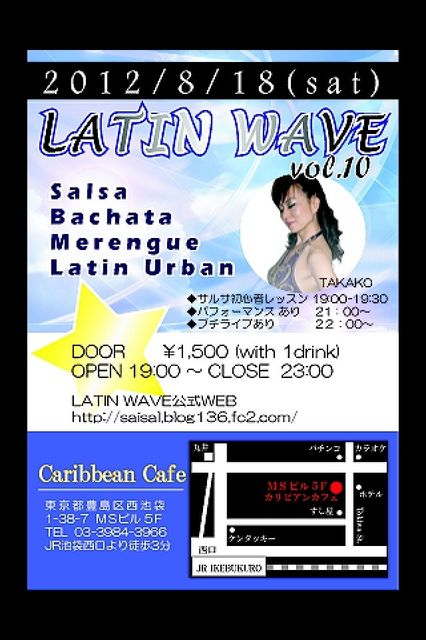 LatinWaveは次回で10回目を迎えます。パチパチ〜 前回始めての会場池袋カリビアンカフェでのイベントも 多くの方にご来場いただき、大変盛り上がりました。 今回10回目を迎えるLatinWaveは8月18日(土)に開催いたします。 会場は再び池袋カリビアンカフェです。 記念すべき10回目!更にヒートアップさせていきますよ! * * * * * 前回とても好評だった初心者向けの無料サルサレッスン。 オープン時間の19時から30分間行います。 講師はTakako先生です。サルサが始めてという方もパーティを 楽しめ
