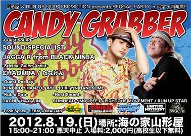 山形屋 & Run Up Star promotion presents 《CANDY GRABBER》 ~CHAQURA 1stミニアルバム「GOOD THING」& たなけん「おかえり」Wリリースパーティー~ at.茨城県 海の家 山形屋 2012.8.19(SUN)15:00~21:00 *悪天中止 入場料 2.000円(高校生以下無料) ◆Special Guest Artist◆ CHAQURA / たなけん ◆Guest Sound◆ SPECIALIST Jyaga-R from.BLACK NINJA LITTLE-UG ◆Guest Dee-Jay◆ RUNBIRD / HANZO / RYO / DIRTY n HANDSOME ◆Rub-A-Dub◆ DAICHI / HAYAJIN ◆Sound◆ RUN UP STAR with.SOUND SYSTEM RUMHEA