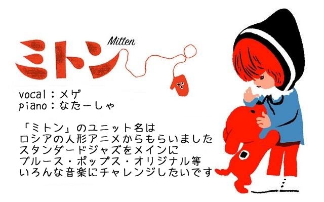 北大阪・茨木で「ミトン」のライブがありますv(*'-^*)b このお店には前回2月におじゃましまして2回目となります 平日ですがご都合よろしければのぞいてみてください♪ ヴォーカル:メゲ ピアノ:なたーしゃ 日時:8月21日(火) 18:00オープン 20:00スタート 場所:茨木「vaughan(ヴォーン)」 (茨木市駅前4丁目 1-2 アイエムハウスビル5F) http://www.hcn.zaq.ne.jp/vaughan-ibaraki/ ノーチャージです ご注文をお願いします<(_ _)> 出演はミトンのみです(ワンマンライブ) 様子をみながら2〜3部構成でやる予