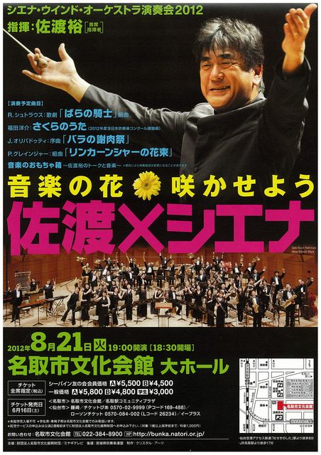 管理人様 貴重なスペースをお借りしまして、告知をさせていただきます。 よろしくお願いいたします。 ************************************ ■佐渡裕指揮 シエナ・ウインド・オーケストラ演奏会2012 ■2012年8月21日(火) ■19:00開演(18:30開場) ■名取市文化会館 大ホール ■全席指定 A席5,800円 B席4,800円 学生席3,000円 ※未就学児入場不可 ※学生席・車椅子席は名取市文化会館でのみ取り扱います。 ※託児サービスの申込みは公演2週間前