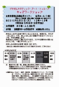 こんにちは 白金高輪を拠点としている劇団KINETIC ART TROUPE岡田組の わたくしMiyoが講師として開催しているキッズ演劇ワークショップを今年も開催いたします。 今年で4年目となり、毎年キッズたちがすごいパワーと元気で参加してくれています。 区民ホールの舞台の上で、 全身をつかって表現して発表するワークショップです。 ぜひご参加ください。 今年は8月21日(火)10時〜16時 高輪区民ホール (東京メトロ南北線・都営三田線「白金高輪」1番出口目の前) 参加教材費:2000円 対象:幼稚園年中〜小学
