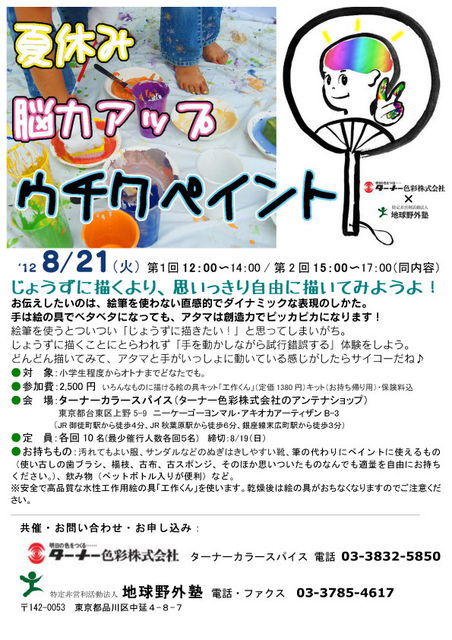 管理人様、大切なスペースをありがとうございます。 8/21夏休みは脳力アップ「ウチワペイント」 自然体験活動の地球野外塾が、半年ぶりにアート&クラフト活動を行うことになりました。 以前から野外での「お絵描きティピづくり」や多摩川の自生の葛のツルをつかって作る「クリスマスリースづくり」などでご協力いただいていたターナー色彩(株)カラースパイスさんと共催となり ターナー色彩の発色のいい、質のいい画材「工作くん」を使って地球野外塾らしいアート&クラフト活動になっています。 どうやって描くの〜? 上手じゃなく