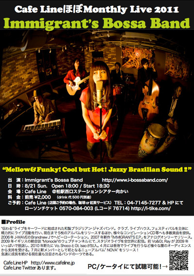 IBB、なにげに千葉初上陸!? 柏Cafe Line ほぼmonthly liveに出演!!! お待ちしてます! 日時 8月21日(日) 開場 18:00 / 開演18:30 出演 Immigrant's Bossa Band http://www.i-bossaband.com/ 会場 Cafe Line @柏駅西口ステーションシアター向かい http://www.cafeline.jp 料金 2,000yen (ドリンク代 500yen別途) 【ご予約】 ■ ローソンチケット 0570-084-003 (Lコード:76714) http://l-tike.com/ ■ Cafe Line 店頭/HP/TELにて (店頭予約の場合、珈琲or紅茶サービス) TEL 04-7145-7