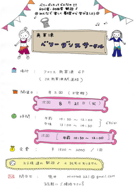 前回のワークショップには暑いなか沢山の人に来て頂きました。 ちびっ子達も多く、賑やかな中レッスン開始・・・ ちびっ子達も一緒にまずストレッチ→ベリーの基本姿勢→簡単な動き→ステップを組み合わせた簡単な振付と基礎を習いました。基礎から、腰まわりを沢山使うので、ベリーはやっぱり女性にとっても良いです 肩を震わせたり、胸を震わせたり、首から上だけを動かしたり、日本人には馴染みのない動きが多いので、難しい所もありますがそこは普段テレビを見ながらでも練習練習 音楽に合わせてちょっとした振付をしてみると、お!っと思う程