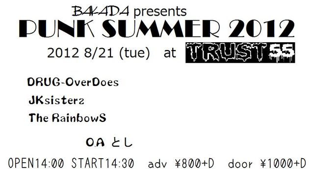キチガイ presents PUNK SUMMER 2012 DRUG-Over Dose JKsisterz The RainbowS ect... <O.A> とし PUNK SUMMER 2012!! パンクの夏です!! ちなみにこの名前はYxSxKがつけましたww あと、出演バンド募集中なので良かったら出演してみませんか??