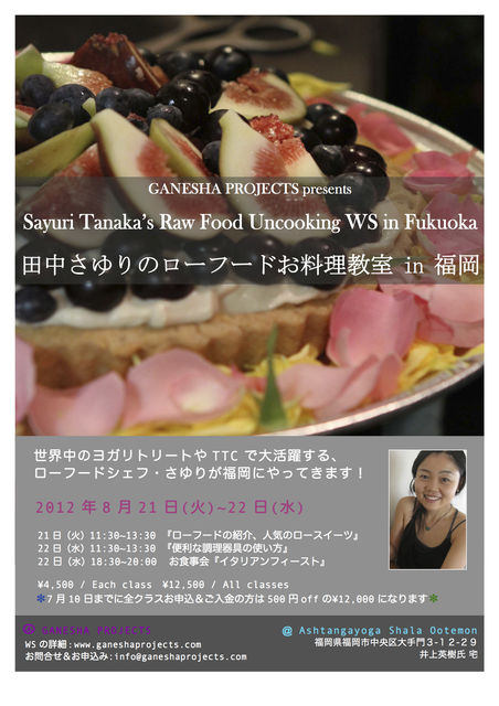 GANESHA PROJECTS presents Sayuri Tanaka's raw food uncooking workshop in Fukuoka. 世界中のヨギ、ヨギーニの舌を唸らせるローフードシェフ・田中さゆりのローフードお料理教室 in 福岡 ローフードってなんだろう? ローフード始めてみたけど、レパートリーが少ない。。。 ローフードを実践しているけどもっと知識を深めたい! そんなみなさんのために、日本が誇るローフードシェフ・田中さゆりが九州初上陸します。 日本国内ならず世界中のヨガリトーリートやティーチャートレーニングなどでケータリングや お料理教室を提供し、自