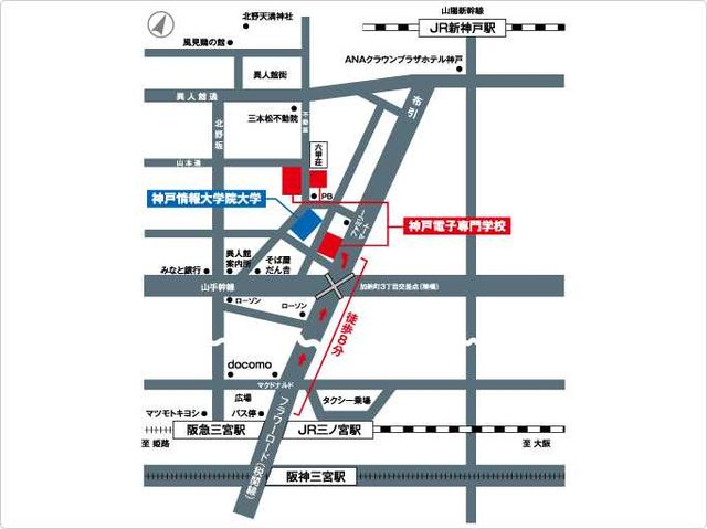 8月21日(火) Sound Technique Festival @ 神戸電子専門学校 http://www.kobedenshi.ac.jp/blog/sound/2012/08/8-21-sound-technique-festival.html Rならびに阪急三宮駅より フラワーロードをすこし北へ。 角に「マクドナルド」がある西隣に「ドコモショップ」があります。 この「ドコモショップ」を右手に見て、北(山側)へあがります。 そのまま4.5分歩くと、角に「ローソン」があり、 信号をわたります。 渡ったら、「右斜め方向」にさらに北(山側)へ進みます。 そのまま道なりに上がっていくと(かなり坂が急になってい