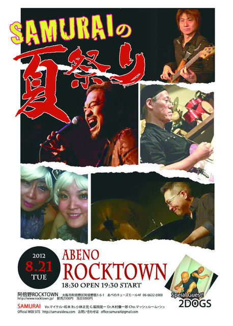 ♪2012年8月21日(火)阿倍野 ROCKTOWN♪ SAMURAI の夏祭り〜!!LIVE! ゲストに2DOGSを迎え、 いつもにも増してパワフルなステージをお届けします!! Open 18:30〜 Start19:30〜 2Stage ROCKTOWN http://www.rocktown.jp/ ■住所 〒545-0052 大阪市阿倍野区阿倍野筋1-6-1 あべのキューズモール4F ■電話 06-6632-6900